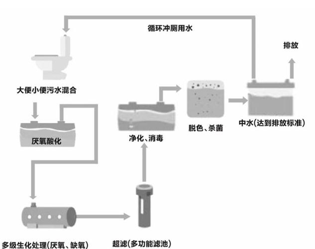 采用微生物技術(shù)和生化技術(shù),將大小便經(jīng)過厭氧、好氧等有機(jī)物反應(yīng),對(duì)有機(jī)物進(jìn)行分解消耗,再通膜過濾,消毒達(dá)到水質(zhì)凈化并實(shí)現(xiàn)持續(xù)循環(huán)使用。